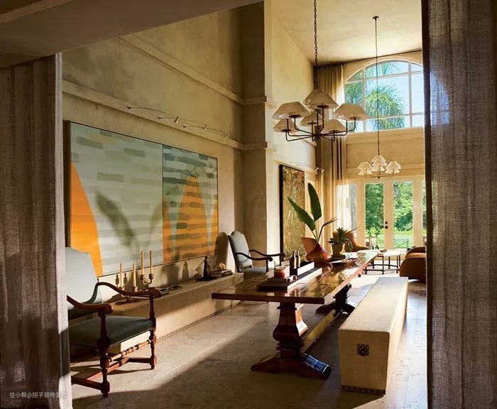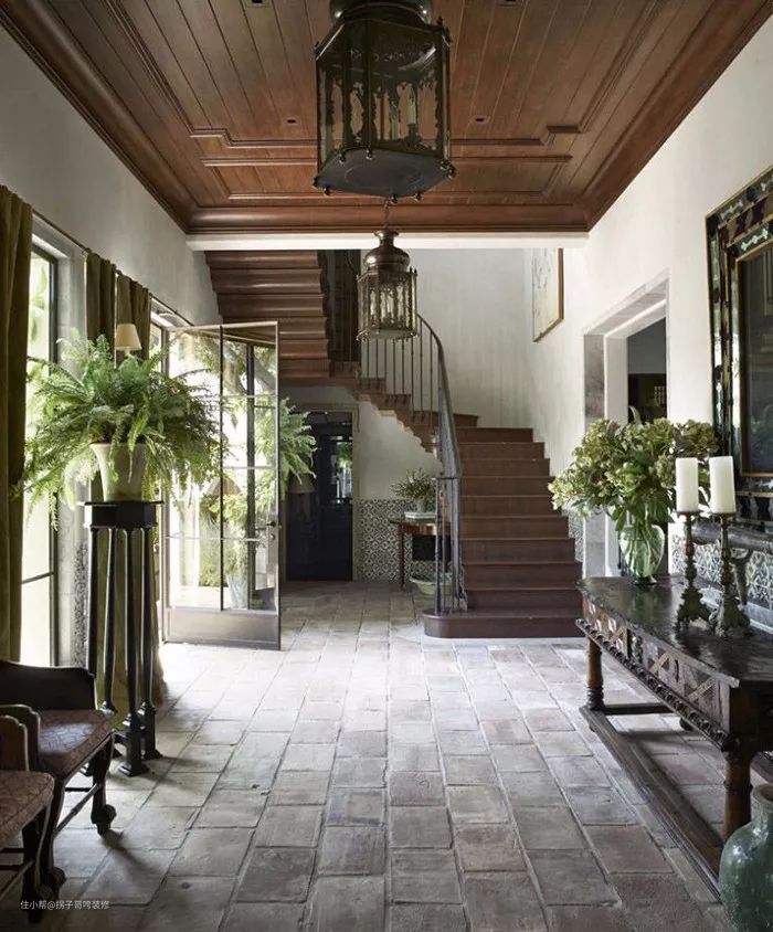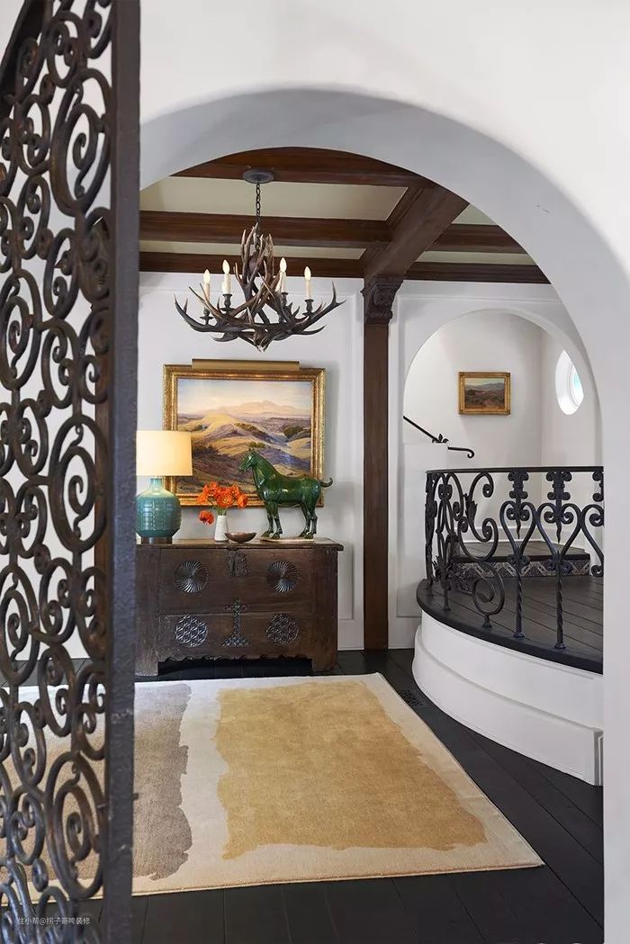 门厅的古董家具是西班牙风格,灯和陶瓷马来自JF陈,鹿角枝形吊灯来自CBS陈列室,地毯是克里斯托弗法尔。