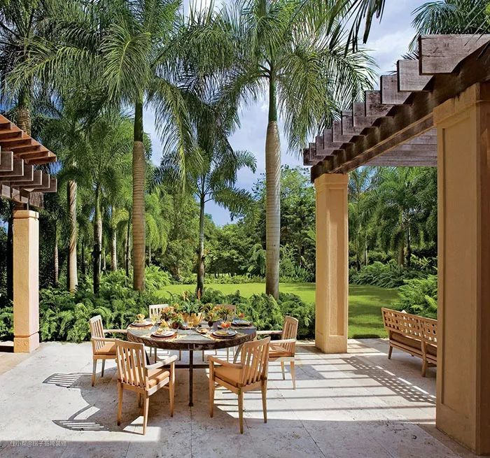 用餐区很现代,有热带庄园的感觉,餐桌两侧是SolísBetancourt设计的长凳,用编织的椰叶覆盖。