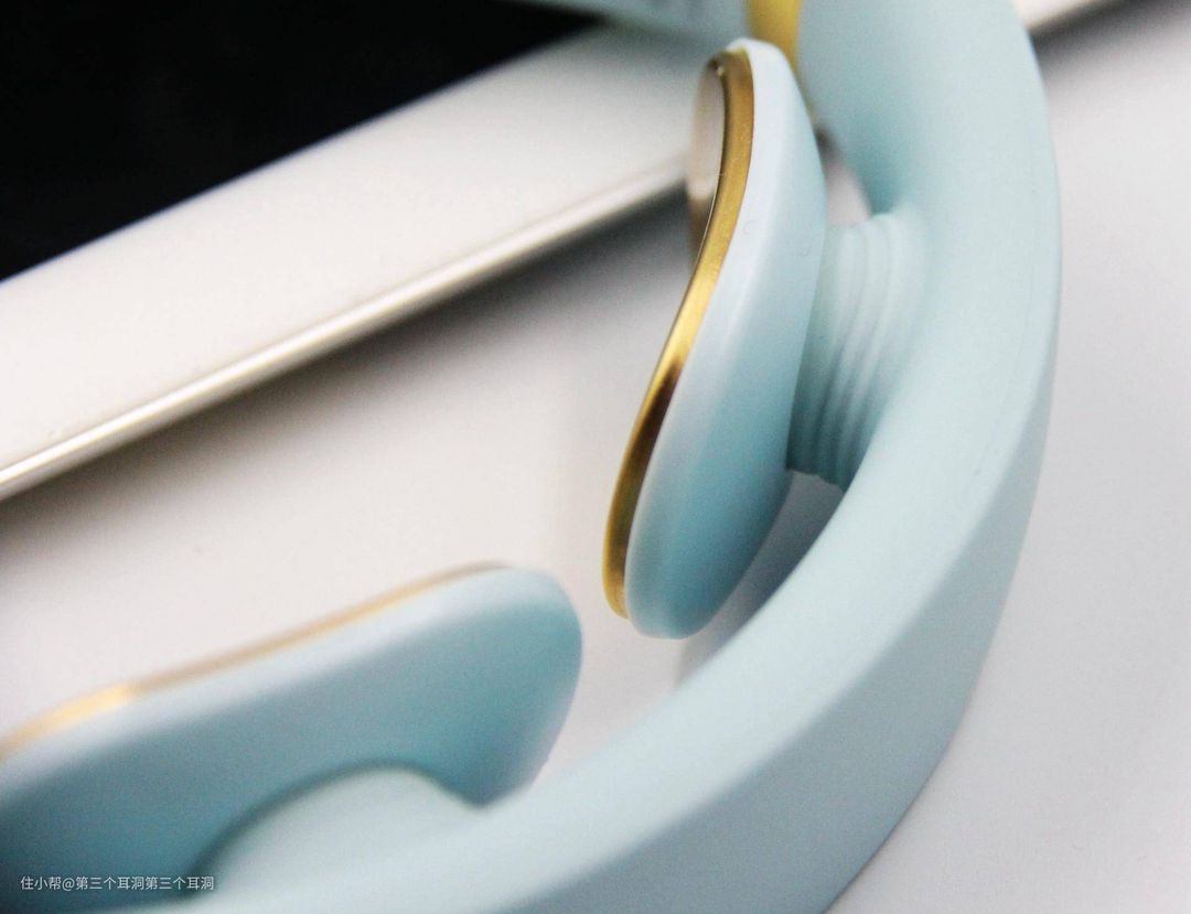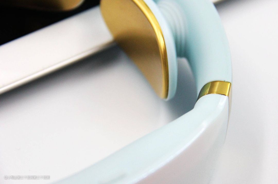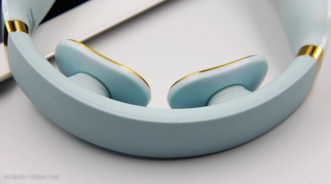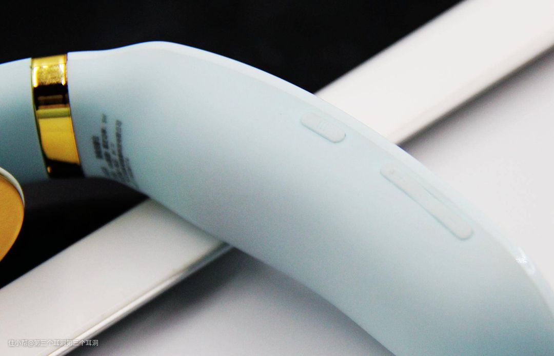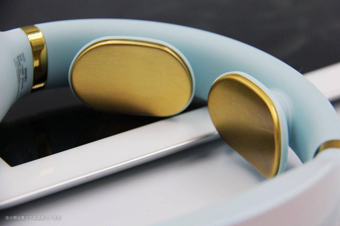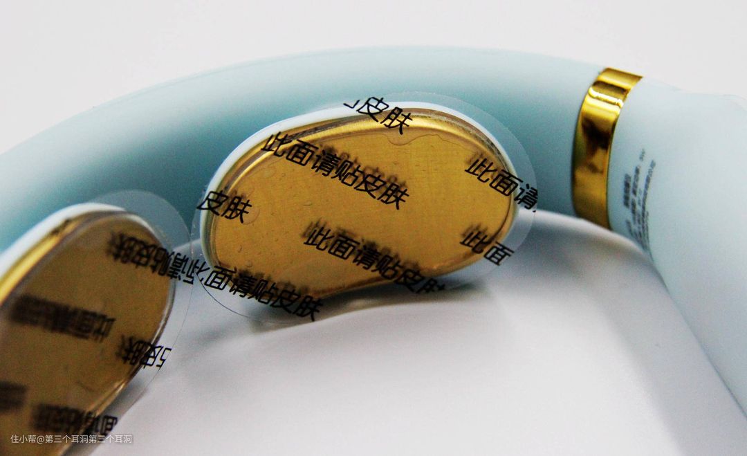 横梁内侧是2片镀金的电极片,对皮肤比较敏感的人来说更友好。电极片的质地光滑细腻,并且有一定的弧度,能够帮助更好的贴合颈部。