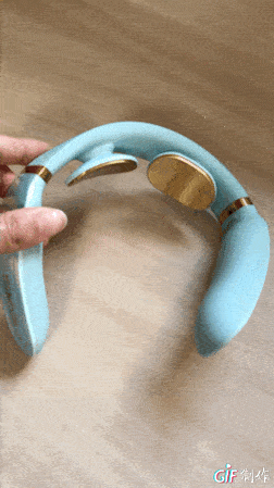 按摩仪机身是U形环颈设计,4点卡位固定。按摩仪的横梁是哑光的,两边外出则是炫光加品牌LOGO,中间用金色的高密连接件拼接,增加了佩戴的稳定性。