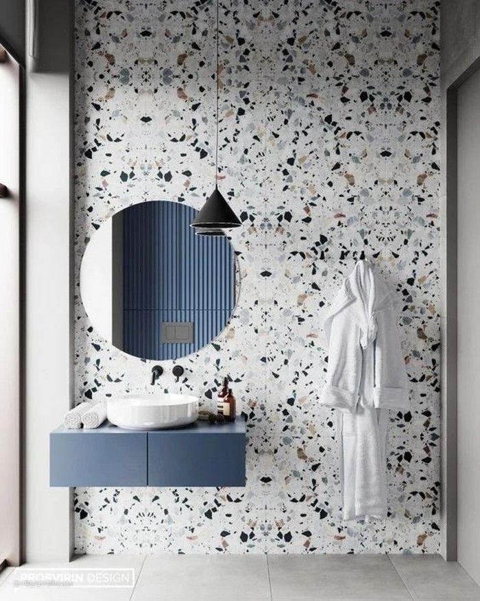 凹凸痕纹理的蓝色波浪砖更有质感,局部运用,会给你带来一面独一无二的背景墙。搭配水磨石的纹理,如同沙滩与浪花,清新自然,富有律动。