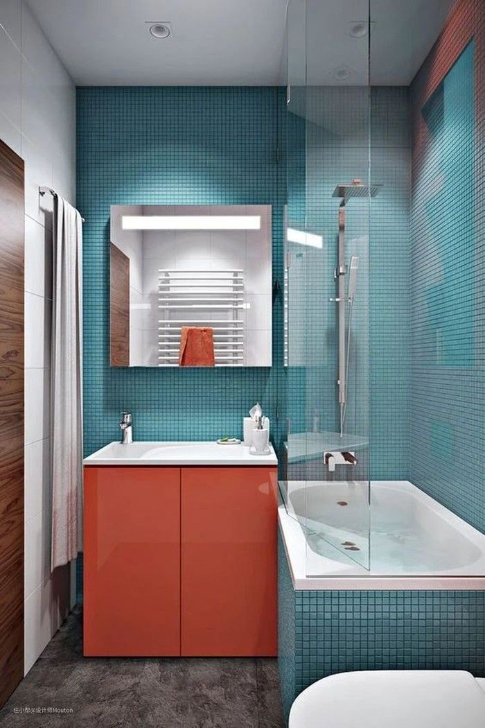 适当的选择橙色软装,点亮蓝色的卫生间,沉静中包含活泼的气息 ,大胆的彰显个性。