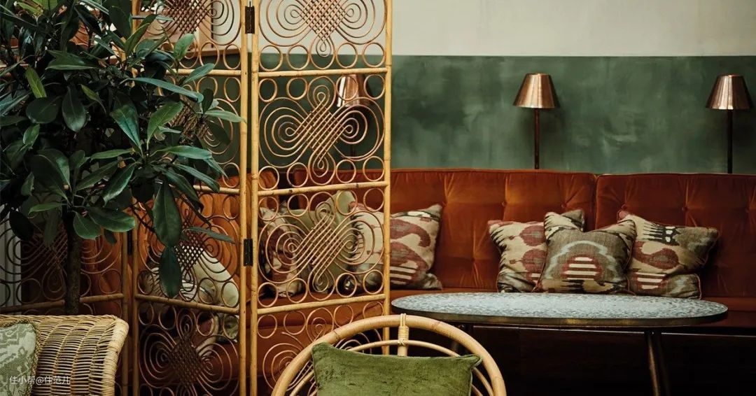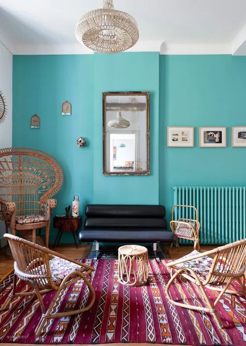 深蓝、墨绿、土黄这些看起来很难搭配的墙面颜色,搭配藤编家具就刚刚好。