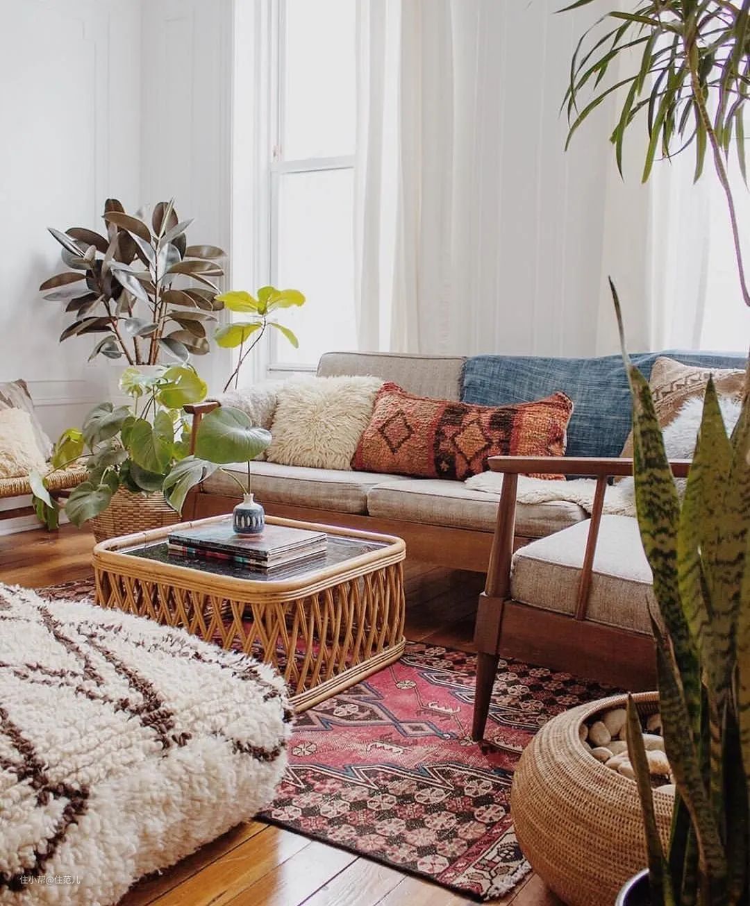 如果是想来点异域风情,那就搭配有花纹的波斯风地毯,瞬间波西米亚的风格就出来了。