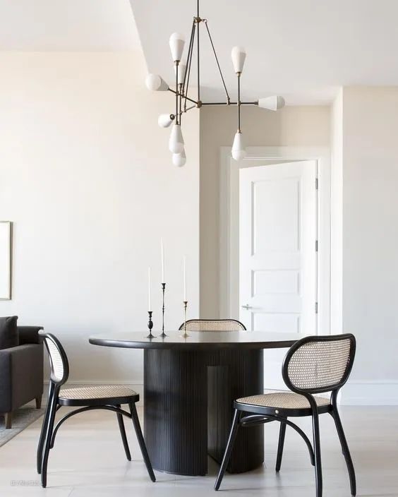 米色沙发与藤编椅子属于同色系,低饱和度的颜色搭配在一起,再加上深色茶几,静谧又优雅。