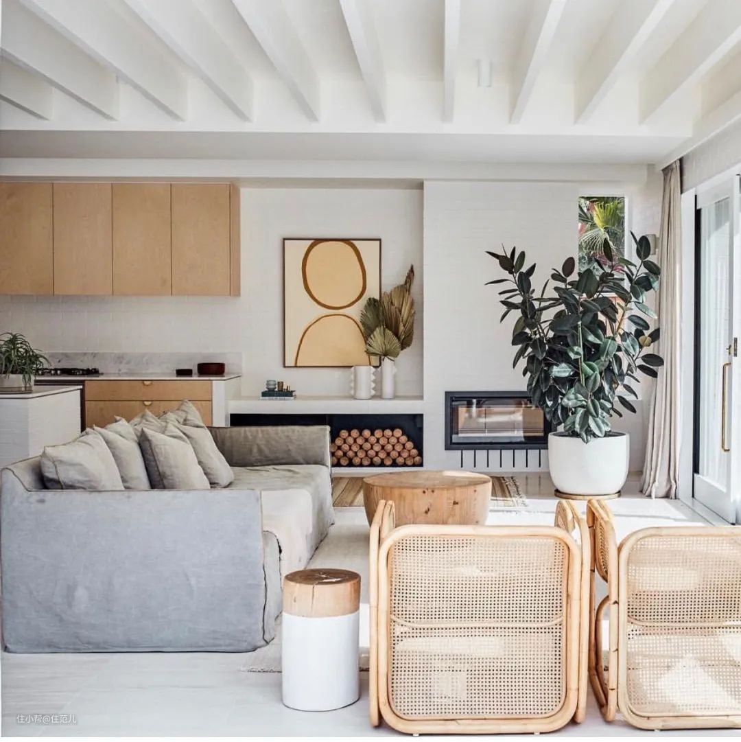 暖色的藤编家具很好的平衡了浅色和冷色调,藤原有的质感凸显出来,轻松营造了温暖舒适的氛围。