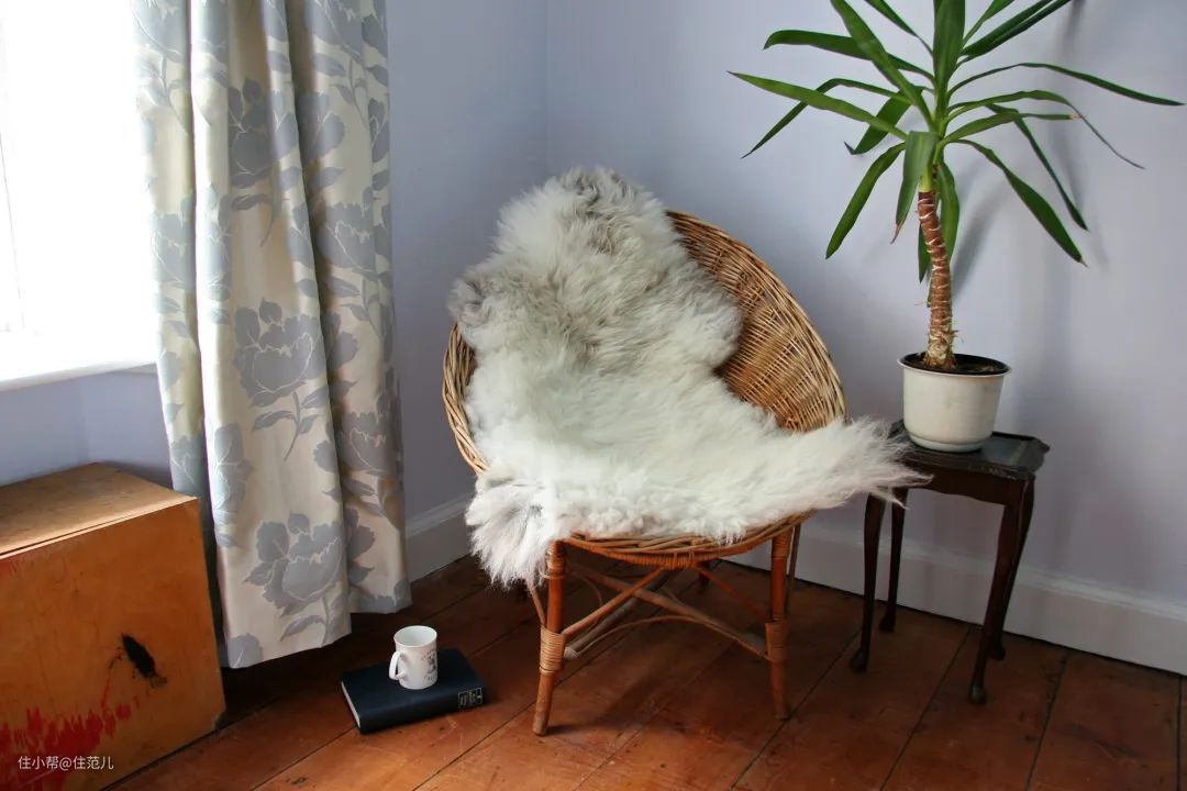 说完了颜色,再说说可以搭配的材质,藤制椅子上放上温暖的棉麻织物抱枕,舒适度翻倍。