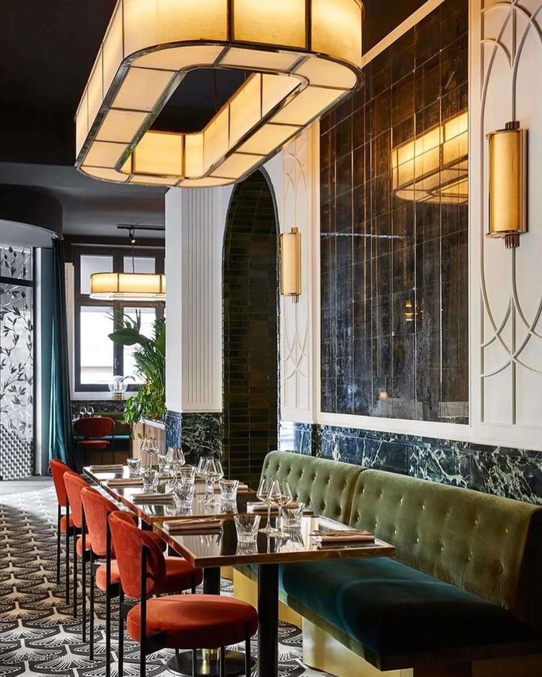 另外一种是直角包围式卡座,这种就适合方桌,能给人很强的围合感,而且美观大气。