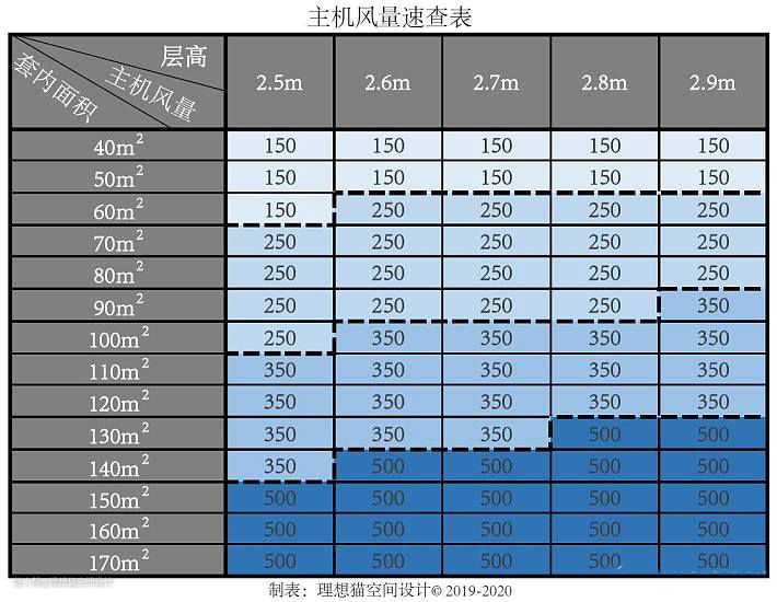 举个栗子:小猫家的套内面积80平,层高2.7米,每小时换气次数取1.0,那么,最小设计新风量Qmin=80*2.7*1.0=216m³/h,所以,选稍大一点的主机风量,即,250m³/h的主机风量。