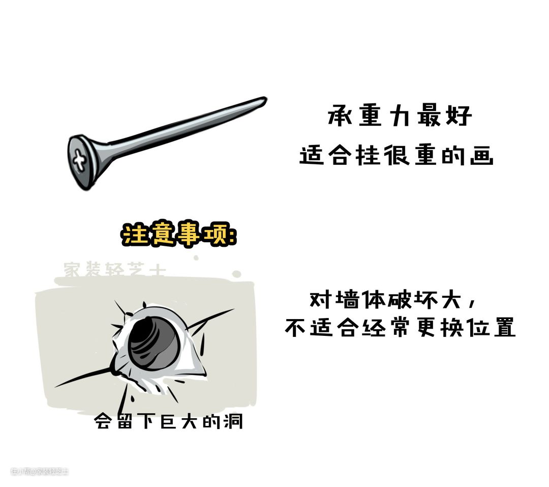 钢钉能牢固的把画固定在墙上,但是对墙表面的破坏很严重;