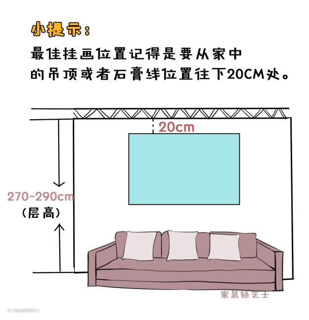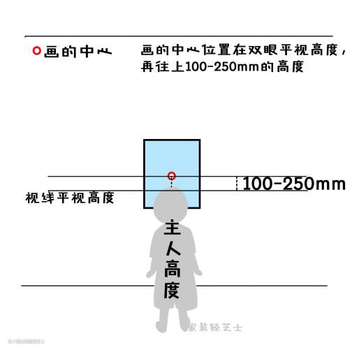 最舒适的欣赏画的高度是观赏者视平线往上100~250mm,因此这个点可以作为画的中心;