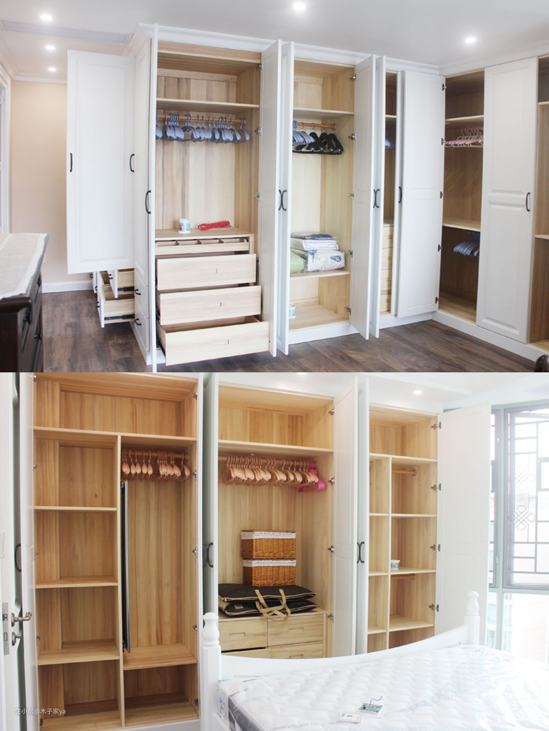 推拉门开门不占空间,拿取衣服方便,但是推拉门不能同时打开,而且推拉门轨道容易积灰,五金配件也较贵。平开门可以同时打开所有门,颜值高,可以做到顶,显得柜子简约好看。如果担心占用空间,可以门板宽度可做到最窄30-40公分,拉开柜门也不会占用太多过道空间。平开门却只需要几个五金铰链和抽屉滑轨即可,构造简单,能省掉不少五金费用。