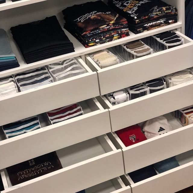 衣柜底部多做抽屉,抽屉对比隔板会实用很多,建议可以多做抽屉,可以根据家里的衣物需求,做不同的抽屉更实用。抽屉建议安装太深,定制成15~20㎝高的浅抽屉即可,衣服卷成块状,拿衣服时一目了然。