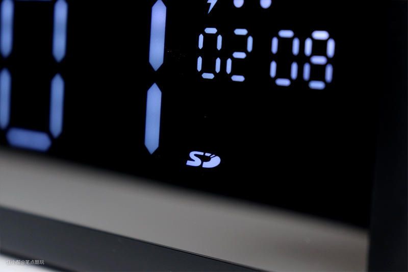 细节展示完毕,通电看看时钟镜面大屏是什么显示效果,拍照时虽然屋内阳光充足,而且下图还未揭掉贴膜,时间显示依然清晰可见。值得一提的是,屏显亮度是可以调节的,方法是单击电源键(开关是长按电源键),可以从1~4级亮度循环切换。