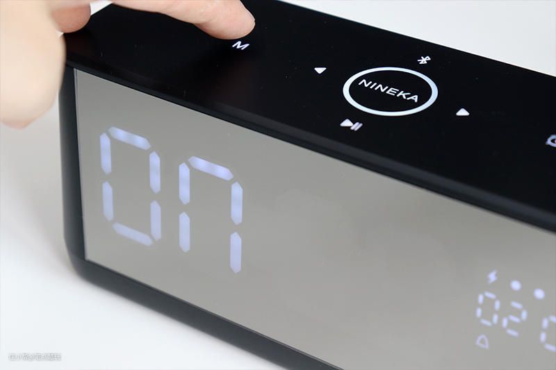 顶部触控区特写,其包括NINEKA标志、圆圈(支持环形触摸音量调节)以及周围6枚触控图标在通电后都能点亮(会定时休眠灭掉)。