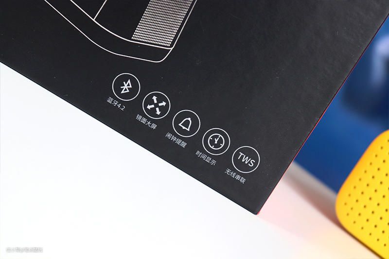 包装右下角5个特色:镜面大屏时钟+闹钟提醒支持;蓝牙4.2版本,可以用双音箱TWS互联为无线立体声音箱组。