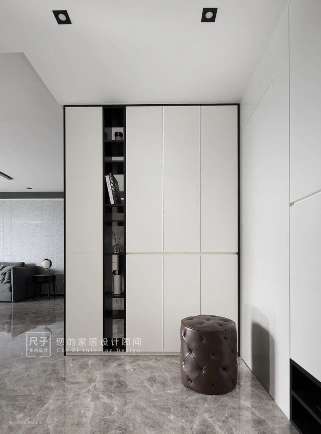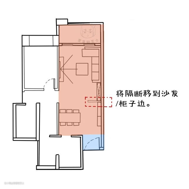 我们也可以将隔断往前移到沙发/柜子旁,让玄关更宽敞。