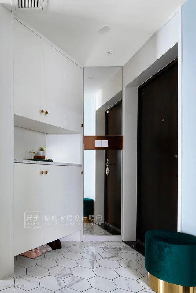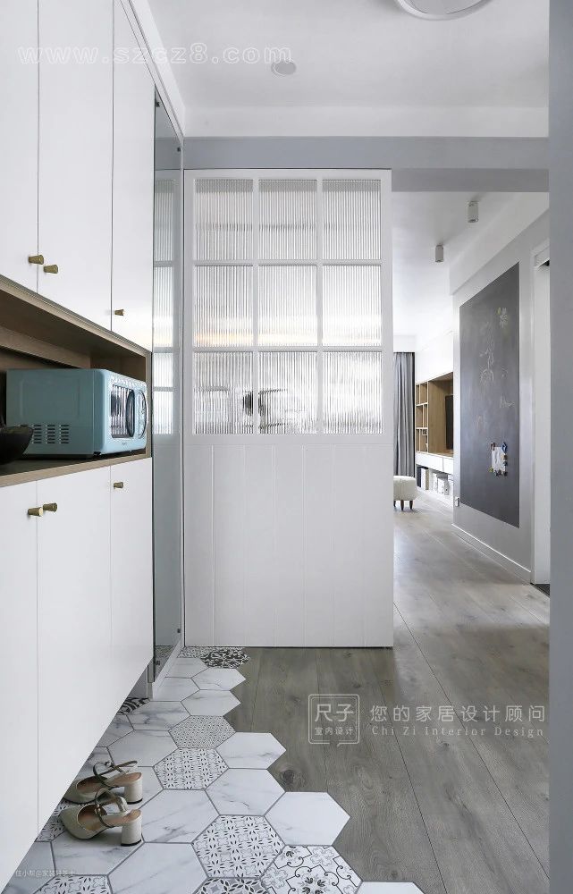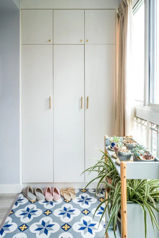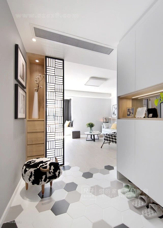 选择合适的瓷砖,对于小户型的玄关尤为重要!可以起到区域划分的作用。最近流行的小花砖或六角砖都是不错的瓷砖选择!