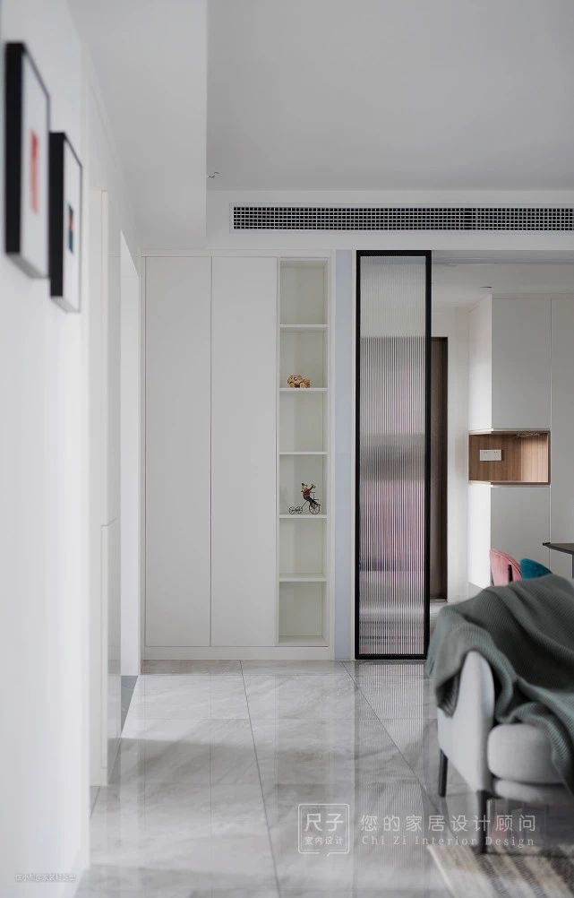 如果家里玄关空间较逼仄,家中的过道位置>150cm,我们还可以将隔断移到过道的入口处,打造一个50CM的半隔断。