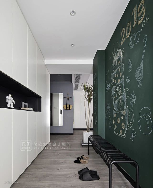 对于玄关的墙面装饰,芝妹强力推荐黑板墙!我们可以在黑板墙上,留下一些话语,(如一些叮嘱,温馨提示,天气变化)把对家人的爱勇敢表达出来吧~
