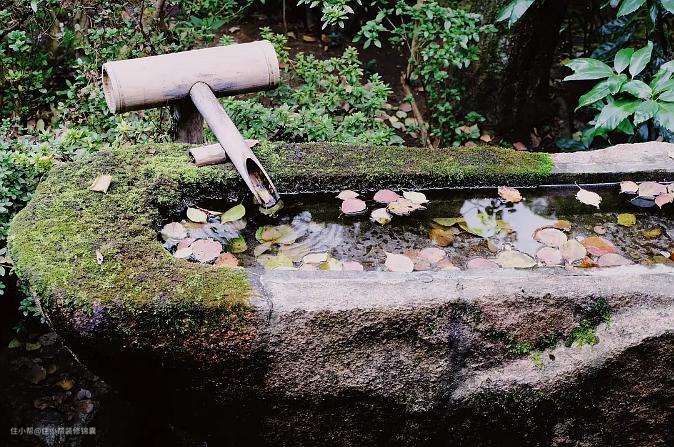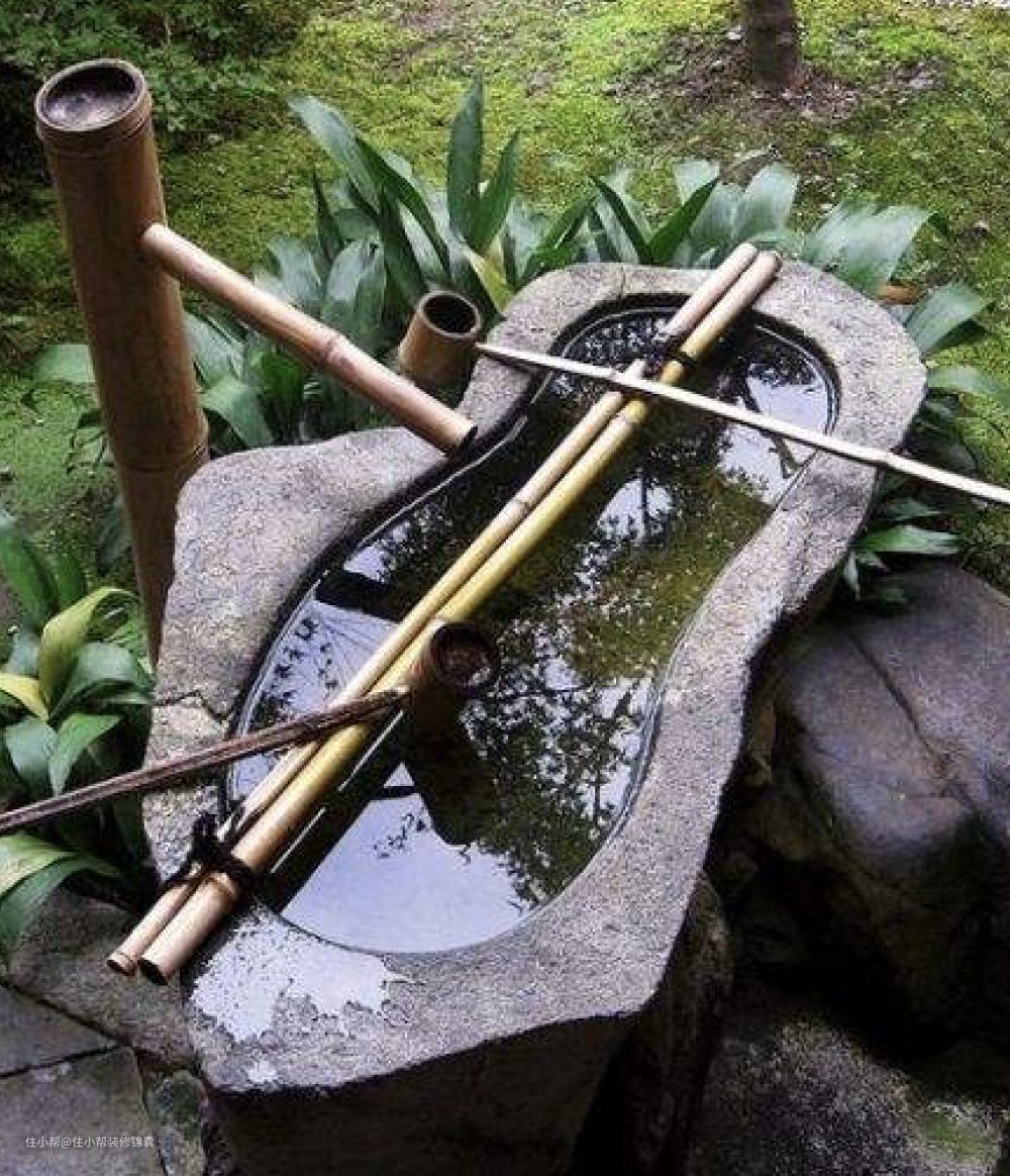 日式庭院的设计一定离不开水,根据个人喜好和庭院面积的不同,可以是一处带有木制拱桥的池塘,可以是角落中一个手水钵。手水钵也有不同的种类,比较常见的是富士型和一字文型