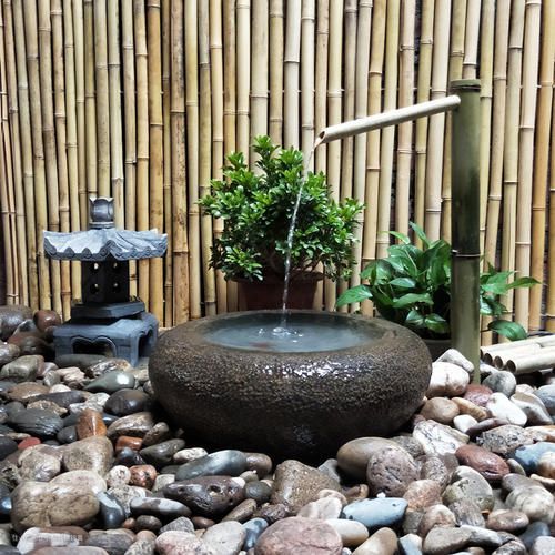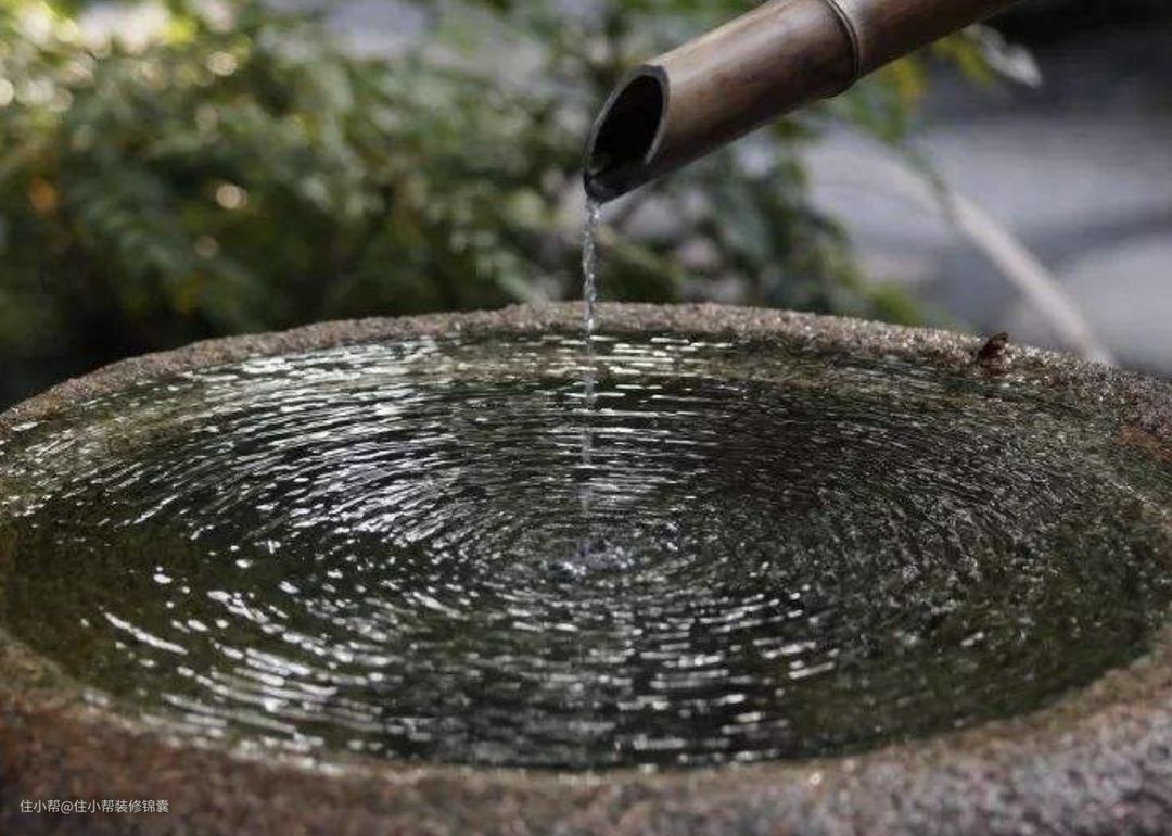 或者选择摆放日本园林中一个有名的竹制小品——“逐鹿”,利用杠杆原理,当竹筒上部注满水后,自然下垂倒空筒中水,而后再翘头,回复原来的平衡,尾部击打在撞石上,发出清脆声响,颇为有趣。