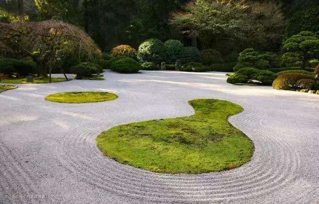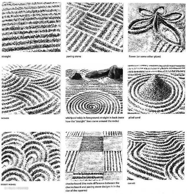 如果不喜欢平整的地面,也可以用细卵石来设计各式各样的水波纹,虽静意动,更加的体现枯山水的意境。传统的日式波纹有涟漪式、起波式、纲代式、男性式、青海式、漩涡式、狮毛式、观音式等。