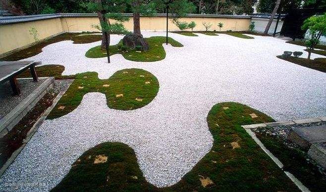 日式肯定不能错过碎石铺地,枯山水。枯山水是源于日本本土的缩微式园林景观,多见于小巧、静谧、深邃的禅宗寺院。在其特有的环境气氛中,细细耙制的白砂石铺地、叠放有致的几尊石组,就能对人的心境产生神奇的力量。