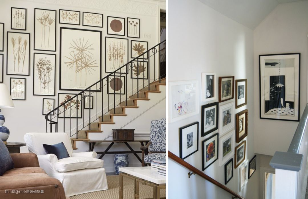 楼梯间简单来说,就是一个每天必经的走道,有大面积的墙面,还有楼板梁柱的框架,整体的修饰上难以处理,但却很适合生活中的展示空间。