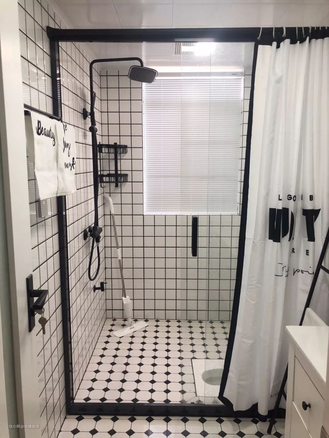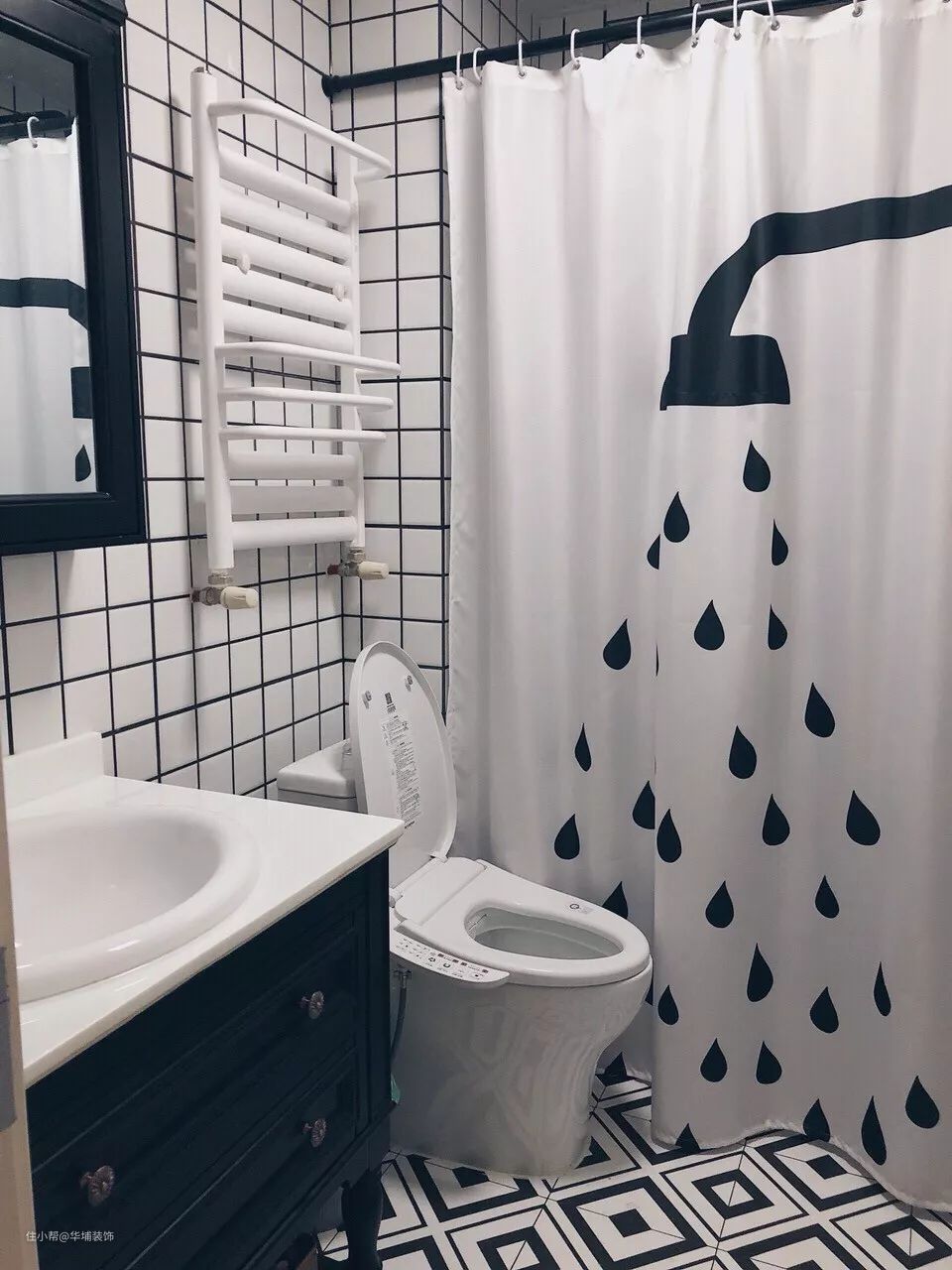 对于白色小格的墙面砖而言,这样简约文艺的元素,能让小卫生间显得更加宽敞自然,再搭配上黑色浴帘杆,那么小空间都会彰显出一个高级大方的简约时尚氛围了。