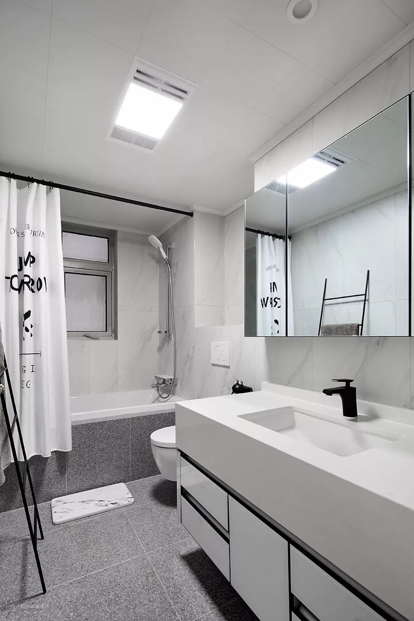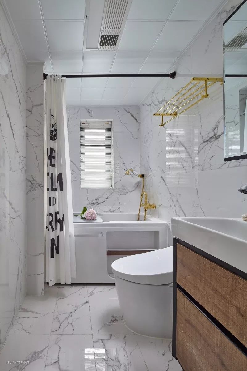 简洁时尚的卫生间,铺上干净优雅的大理石纹理墙面砖,整体空间也是非常的高级端庄,再搭配黑色的浴帘杆搭配,相信空间会更加高级端庄。
