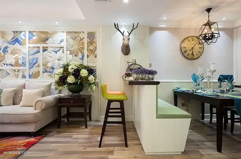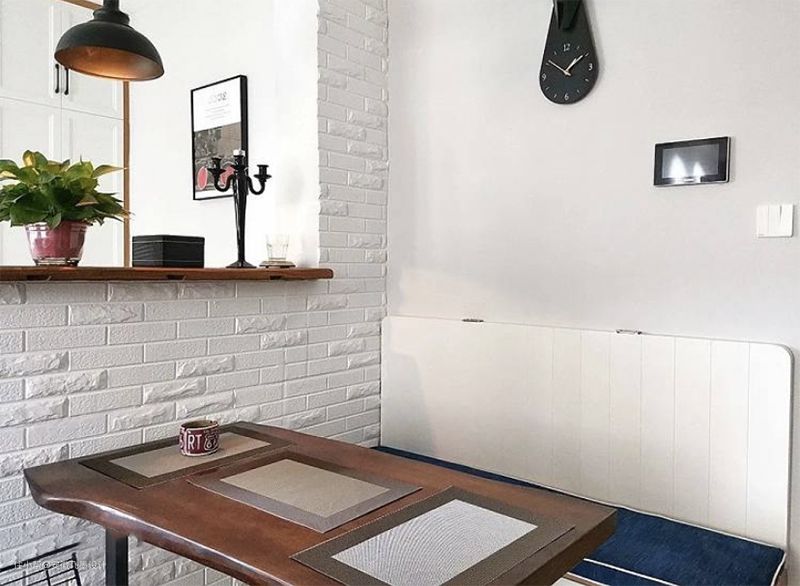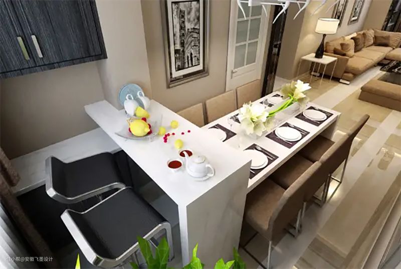 隔而不断,让餐厅形成一个整体开放式餐厅虽然节省空间,但是看起来总有点尴尬。表妹就很聪明,不仅在餐厅做卡座还用吧台将餐厅一侧围起来,相当于给餐厅做了隔断让餐厅在视觉上形成一个整体,规划了单独的区域,避免了餐厅只有一张桌子看着寒酸的尴尬。