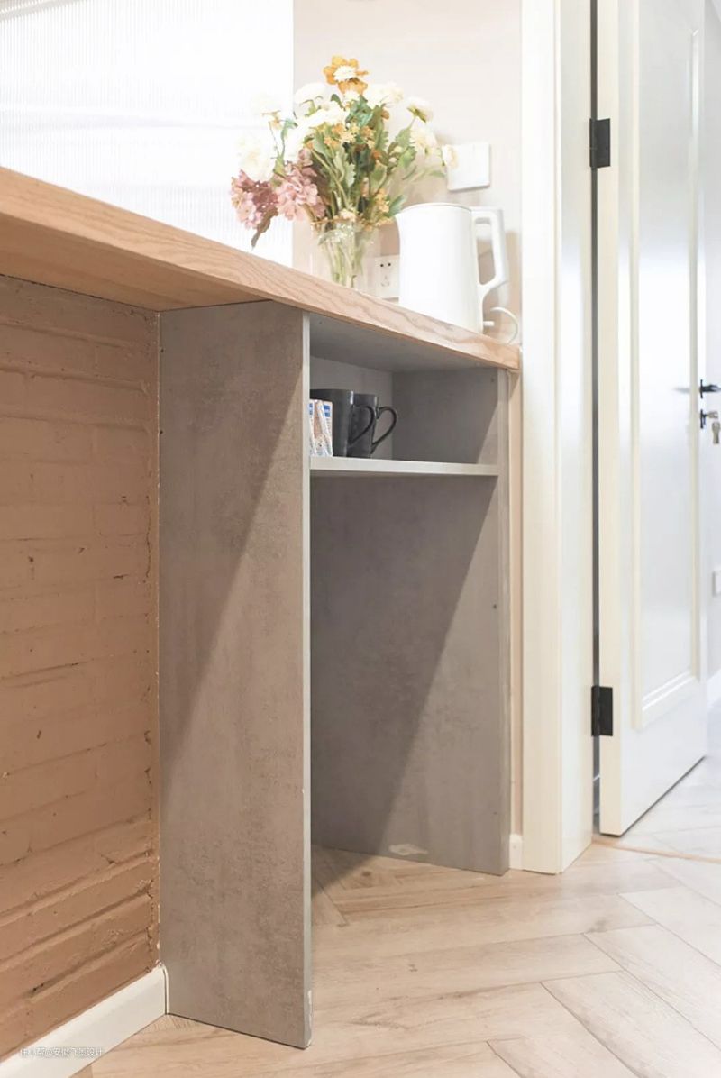 代替餐边柜表妹说卡座和吧台现在家里装修基本上都有,但是都是分开设计的,而她家这种一体式的设计相当于升级版。吧台装在卡座旁直接省了一个餐边柜,吧台里里外外都能储物,餐厅里的瓶瓶罐罐可以放在吧台里不比餐边柜的差。