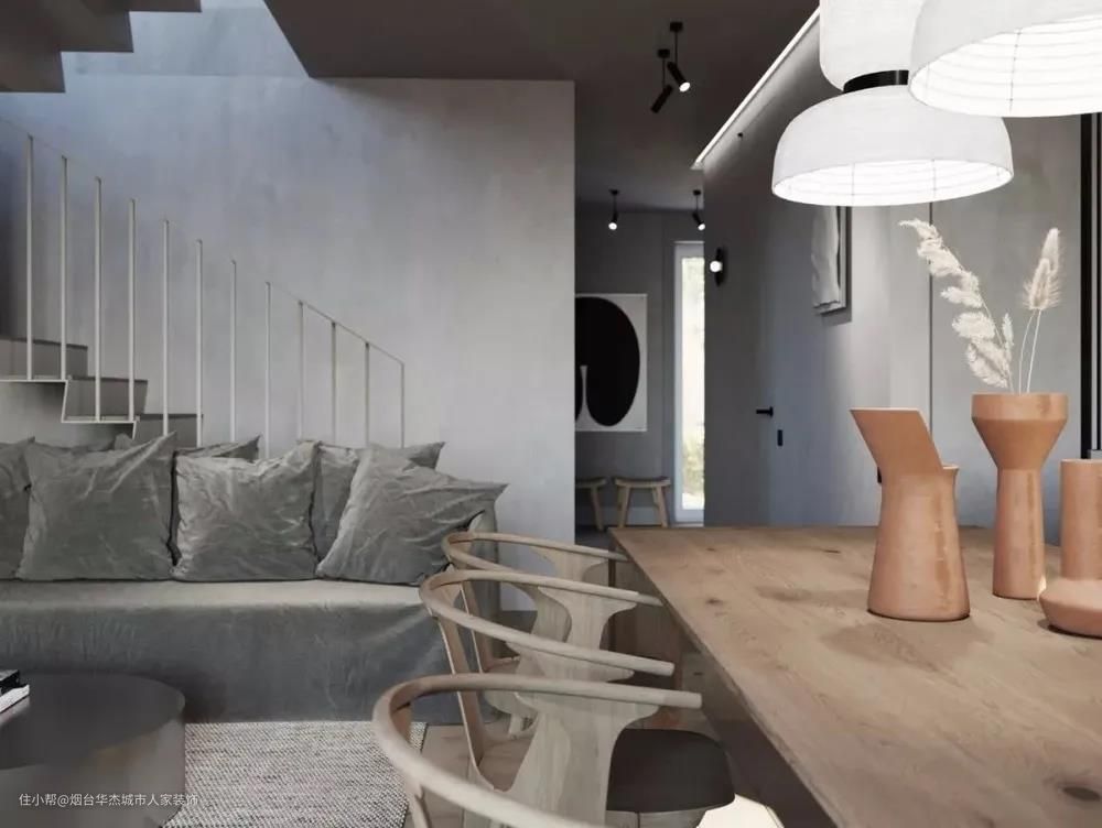 开放的起居室采用纵向布局,在大量浅灰色调中糅合适当的黑灰色实木餐桌除了区分功能区外天然的纹理同时展现出柔和质感