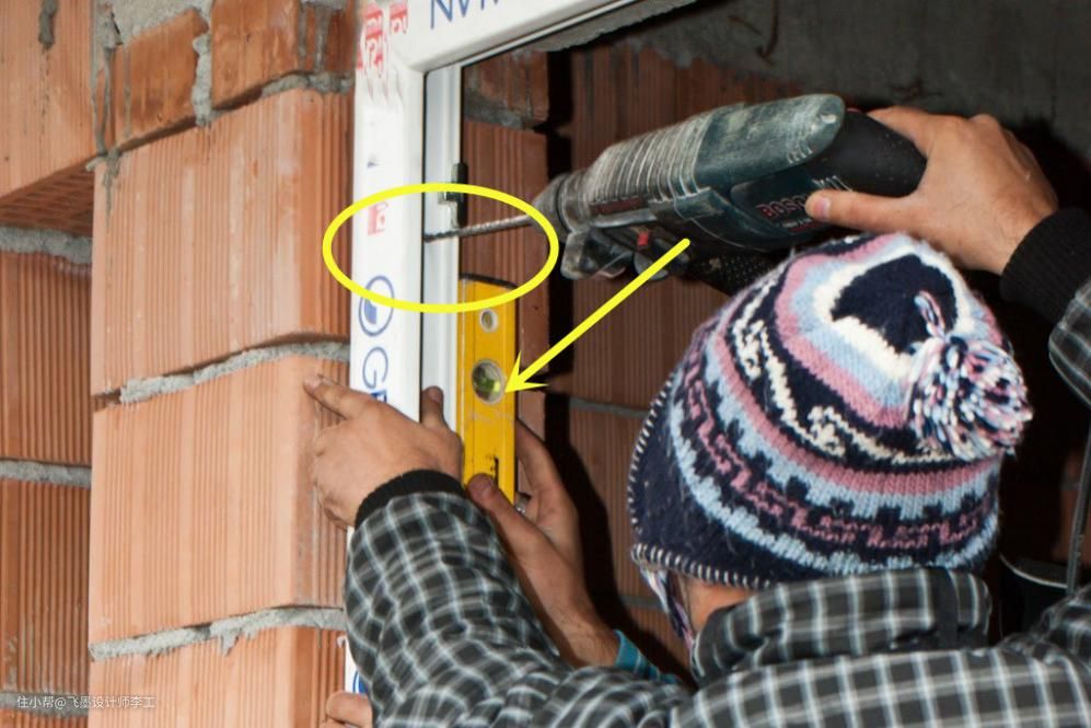 2、在水平仪的辅助下,用钻机对准框架边,上下、左右进行钻孔,然后利用电动螺丝刀将自攻螺钉,对着孔,将整体框架固定在洞口里。注意钻孔的深度不要太深,与自攻螺钉的长度相符合即可。
