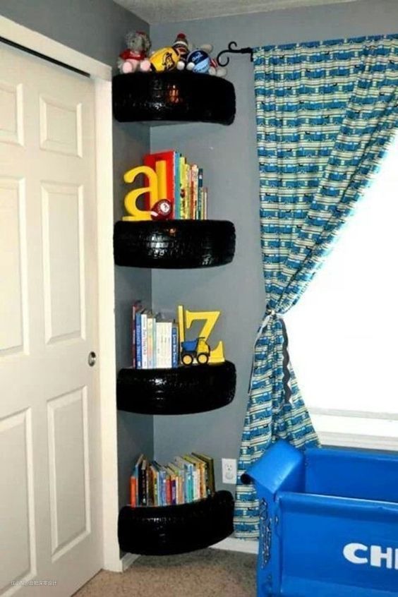 不想费力的就找点省力的做法,将旧轮胎外表收拾干净,里面加上3、4块置物板,放点小玩具做装饰,如果你家有男孩,压根不用担心他不喜欢!