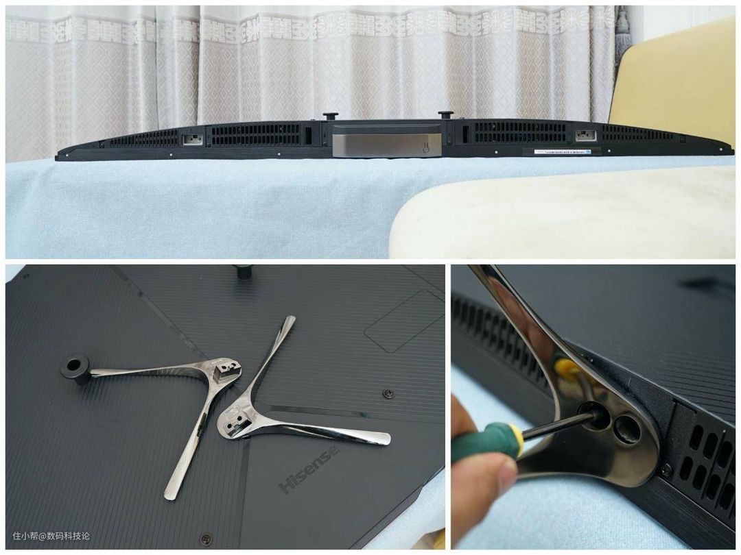 海信55E8D电视机支持壁挂安装和底座安装两种方式,自带垫块和V自型金属支架。支架的做工不错,镜面电镀钨金色,双螺丝限位安装,安装也很方便。