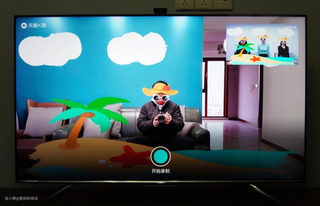 此外,海信55E8D还支持拍照和视频的录制。其实我对于使用电视拍照这件事还是很喜欢的,有空全家人聚到一起共同拍下一张全家福,幸福感满满。值得一提的是,海信55E8D还支持各种不同的背景、贴纸,以及滤镜,功能有些类似于现在的美图软件,十分强大。在拍照方式方面,除了遥控器充当开门之外,还支持语音拍照和手势拍照,特别有意思。