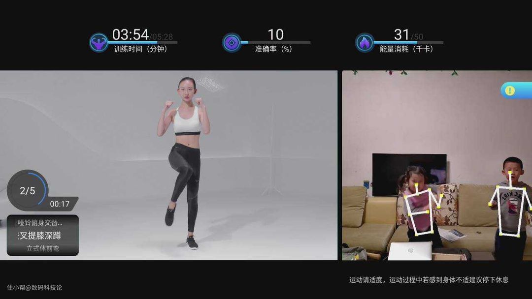 如上图所示,画面左侧是AI健身中的专业教练,右侧则是我的两个孩子,孩子跟随左侧的教练进行训练。而且摄像头并不仅仅是拍摄,而是对孩子的动作进行捕捉,如果做得好或者做得不标准时,还会有相应的提醒。而且海信55E8D电视机其摄像头自带物理锁,想用的时候可以遥控升起,不想用的时候还能通过物理锁禁止升起,更好保护个人隐私信息。而且摄像头升降速度也还不错,基本上是秒开。