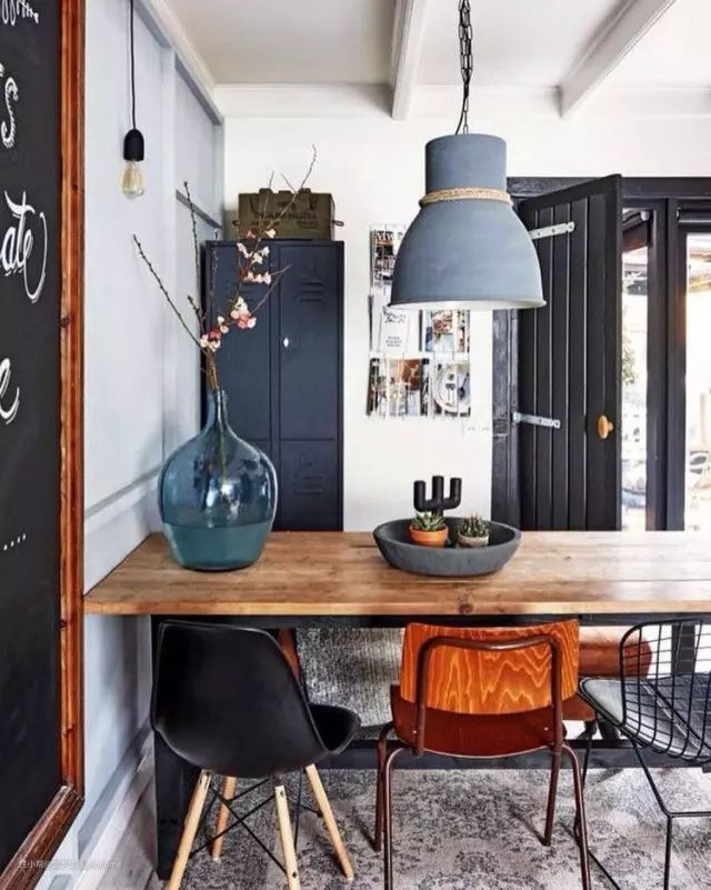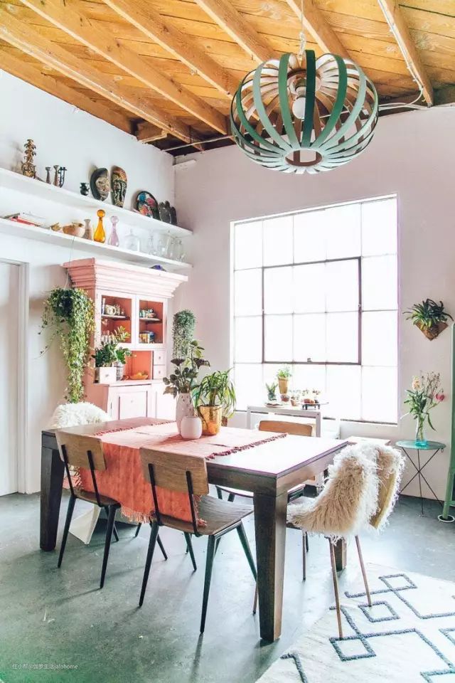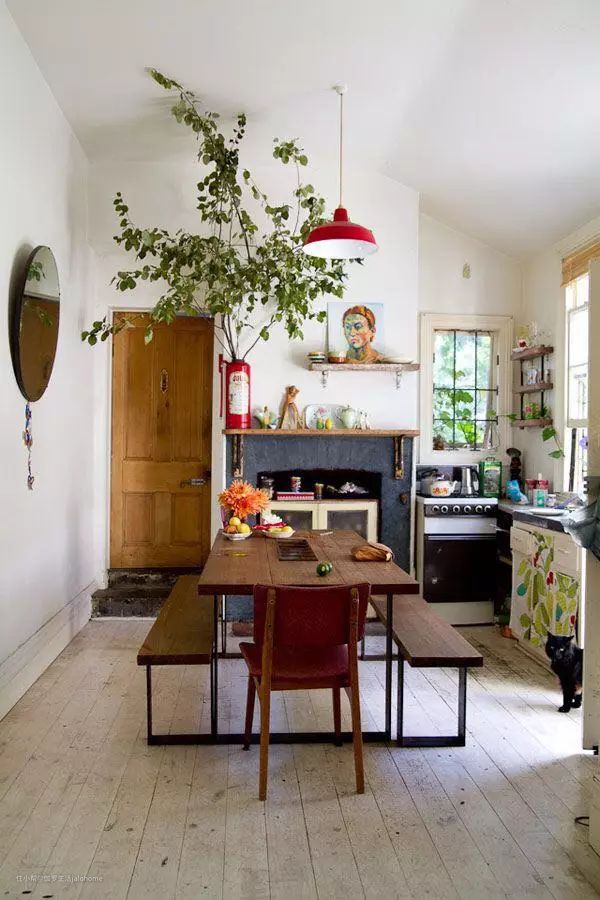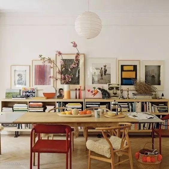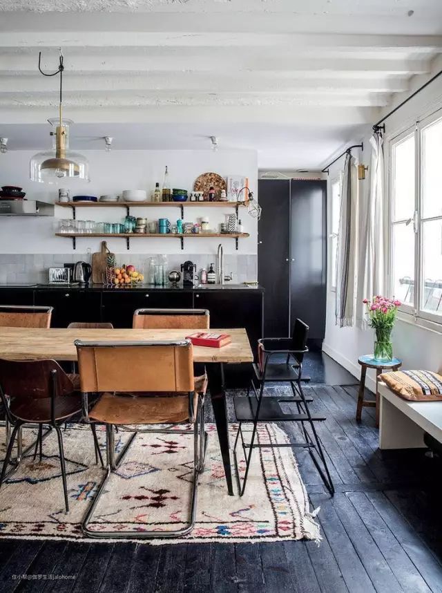 在这么狭小的地方,如果再强制区分出厨房和饭厅、饭厅和客厅、客厅和书房,十分拥挤,看起来堵得慌。倒不如直接将它们合而为一,用一张桌子分出不同的功能分区,吃饭和聊天,工作同娱乐,动与静……围绕一个“舞台”展开生活,既显得宽敞,又不至于凌乱(这就是我们写过的核心区理念,戳这里看)。