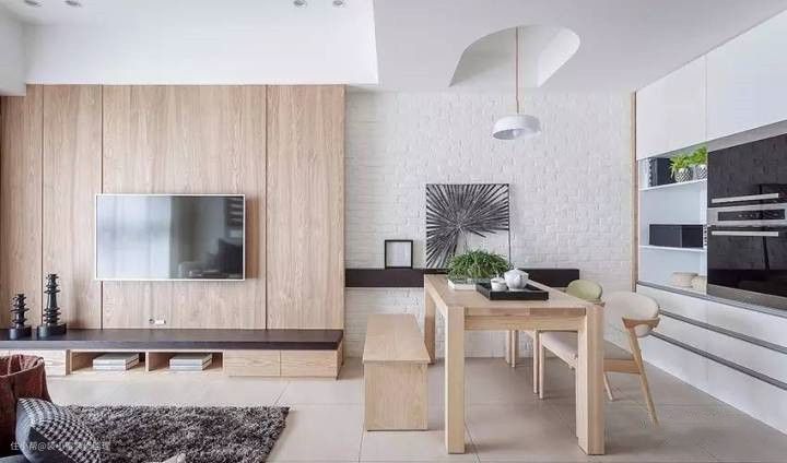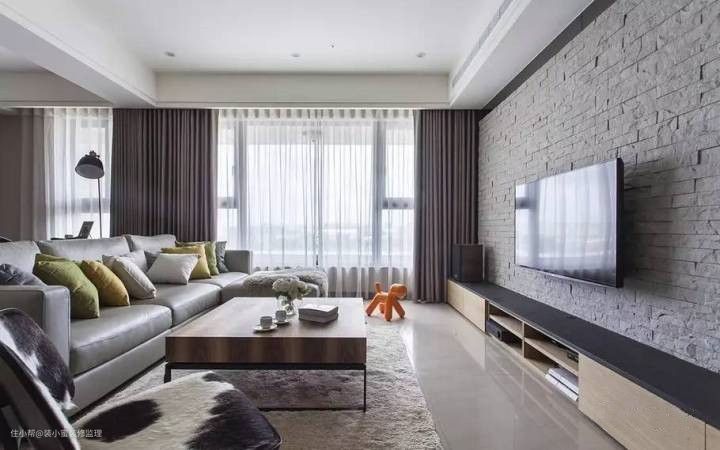 32 现代风甚至把砖用于客厅背景墙造型,大块砖可以仿木、仿石,小块砖则是妥妥的文化感。
