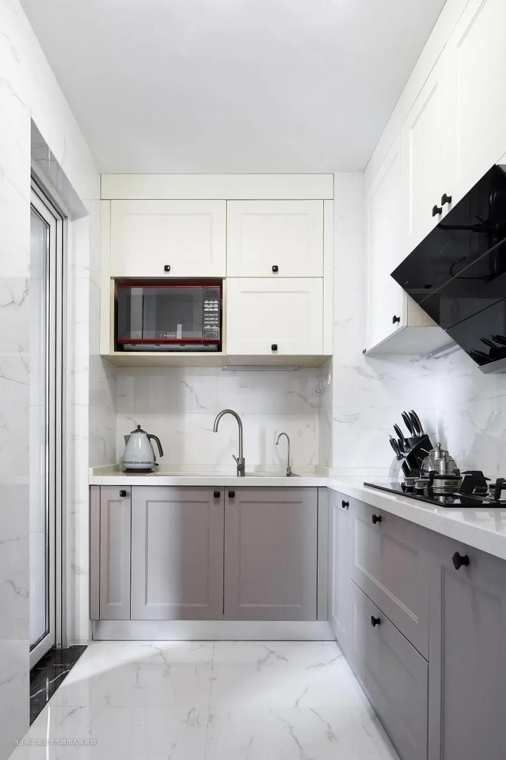 为了减轻空间的视觉厚重感,在整体橱柜色系上选用偏暖的白色,以配合白色磨砂玻璃推拉门,尽显简洁。