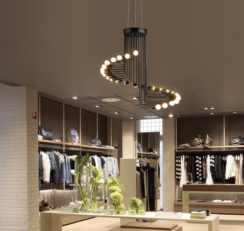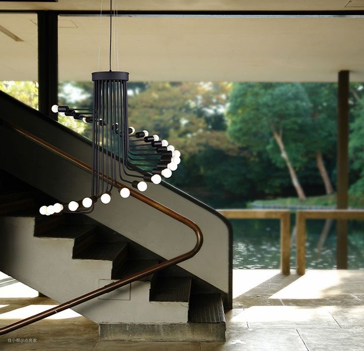 这类螺旋上升的吊灯,可以拉长空间高度,特别是家里loft或高挑空的房间,非常适合这类吊灯,如果家里有楼梯或转角的,装这类吊灯相当个性。