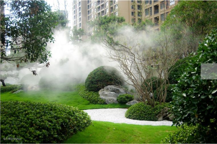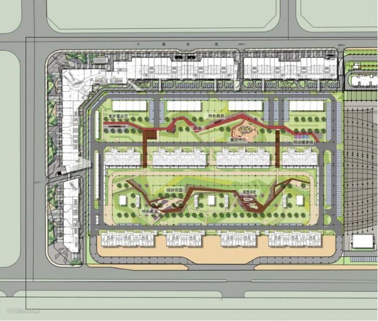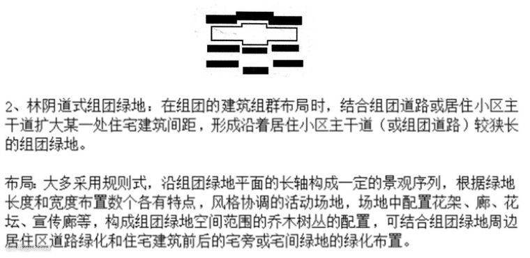有的小区不设中心游园,而以分散在各组团内的绿地、路网绿化、专用绿地等形成小区绿地系统,也可采取集中与分散相结合,点、线、面相结合的原则,以住宅组团绿地为主,结合林荫道,防护绿带以及庭院和宅旁绿化构成一个完整的绿化系统。