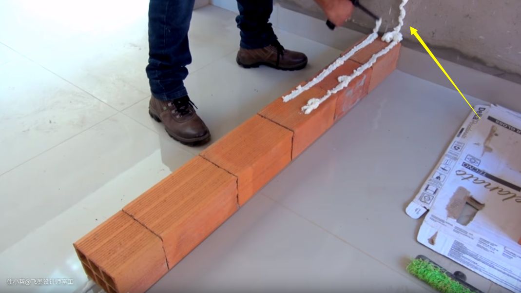 然后靠墙也打一点粘合剂,将提前切割好尺寸的空心砖,依次码成一排,与粘合剂黏合固定在地面上;