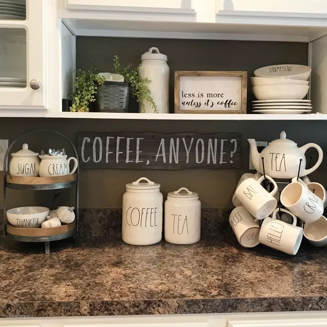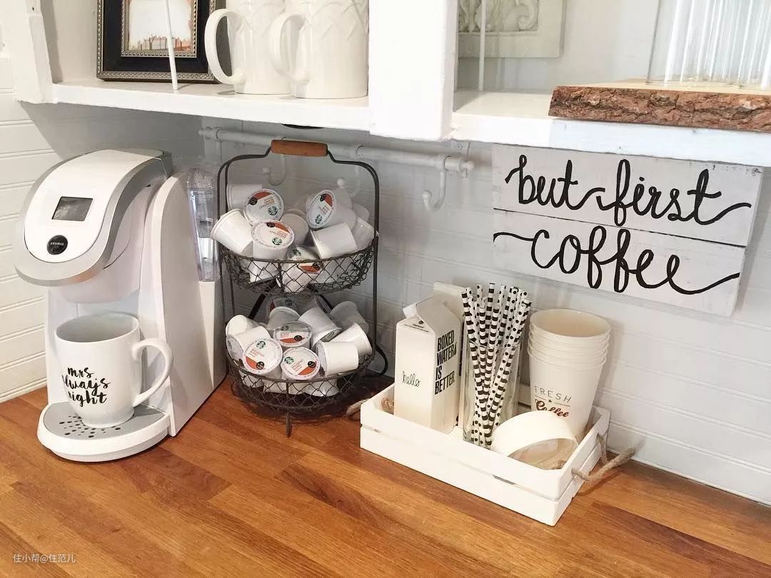 你可以买一个小矮柜,把陶瓷杯、咖啡豆甚至是咖啡机都放在上面,占地面积比一整面墙小得多。