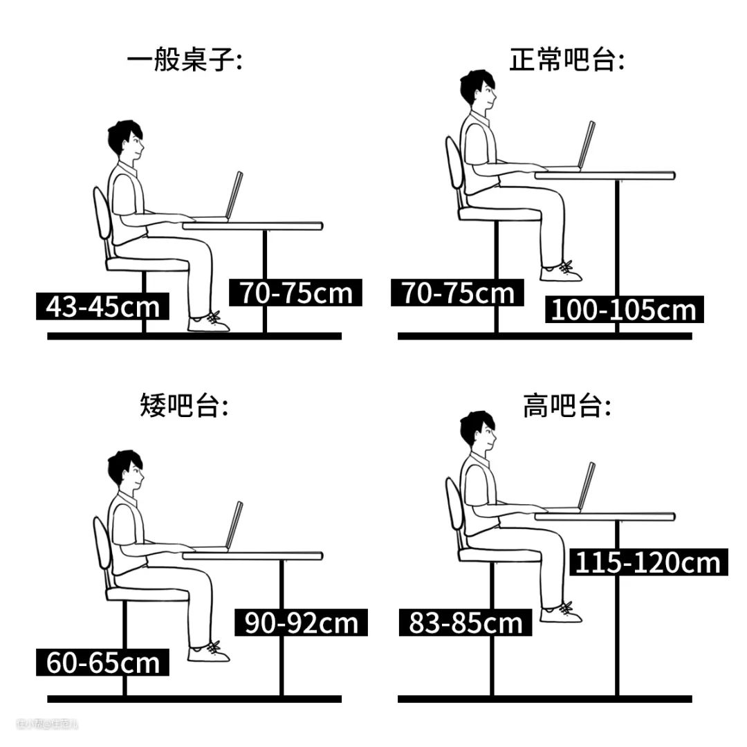 太高的吧台坐上并不舒服,很多人也不习惯。所以吧台与吧椅的高度一定要配套,具体情况可以参考下图。