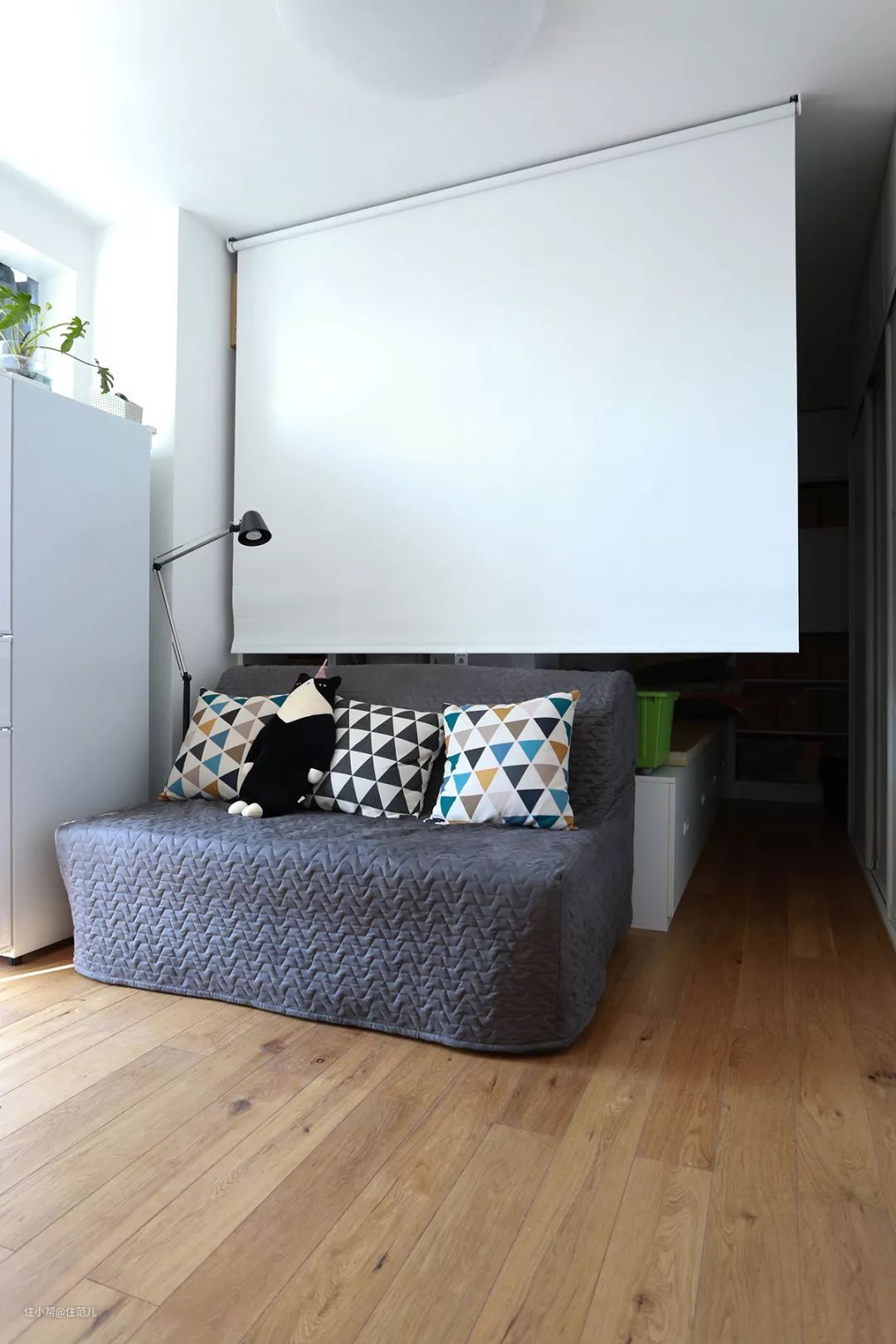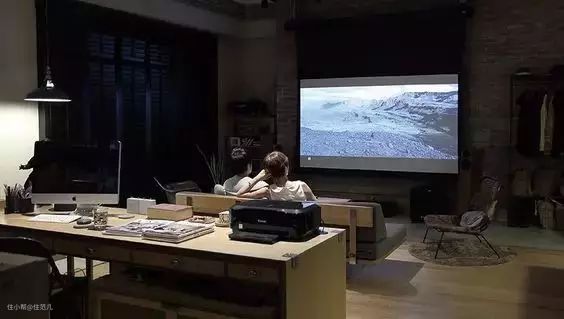 如果家里没有空白的墙面,那就得提前规划好幕布挂在哪儿。可以把幕布直接挂在窗户前,除了节省空间,还省了窗帘的钱。