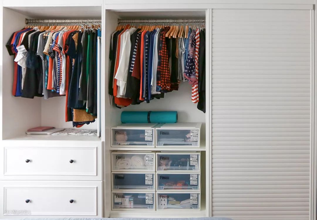 例如短衣区和裤挂区中间,特地留出了空白,那么之后还可以见缝插针地放一两个包包,或者再买一个小塑料抽屉放袜子或内衣。