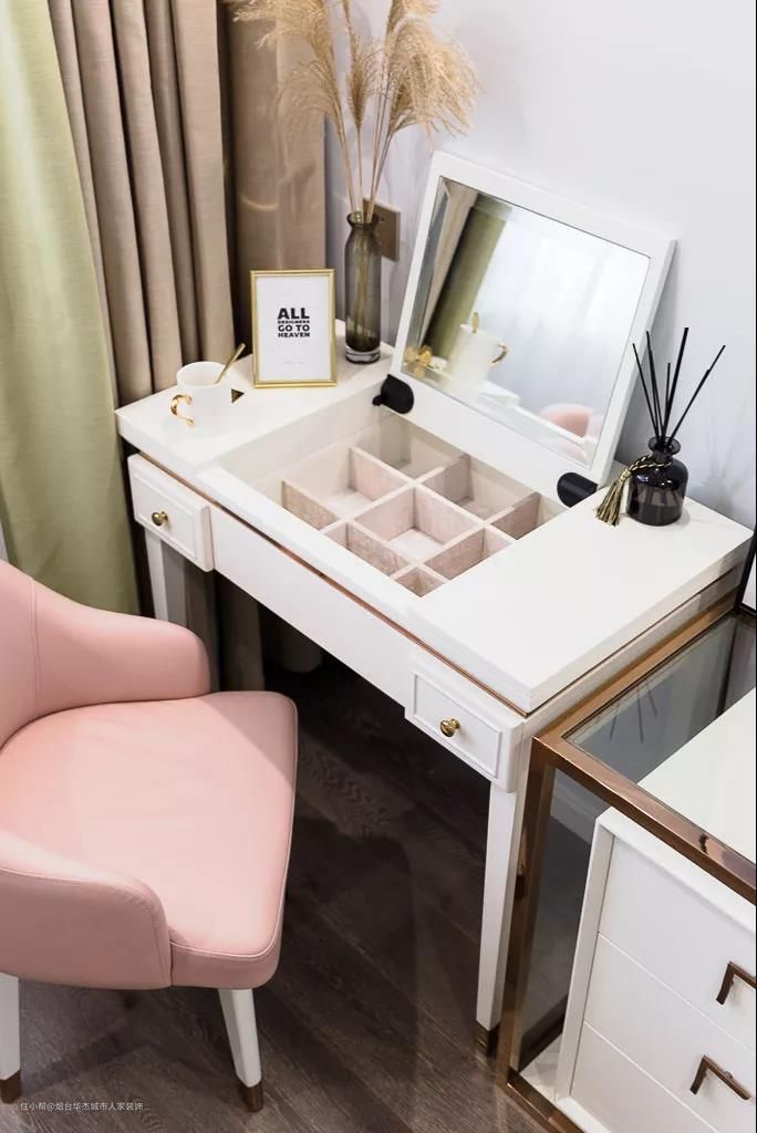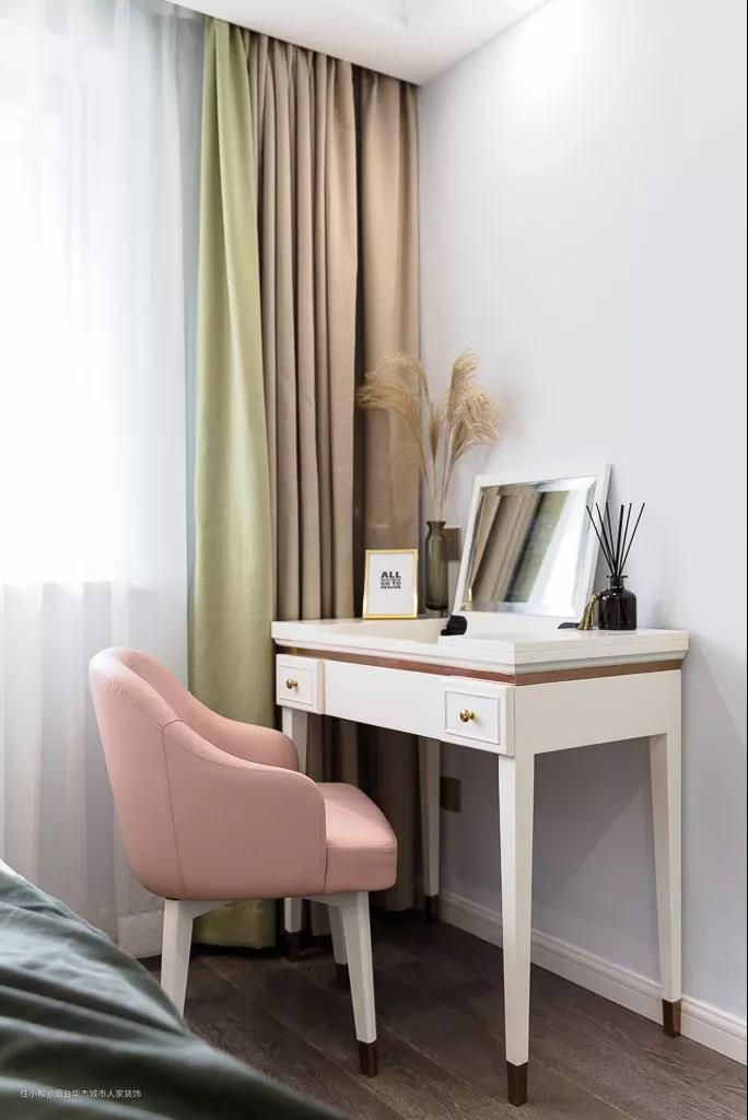 梳妆台搭配了一张粉色调的椅子,结合茶绿+米色的窗帘,带来一种轻盈舒适的浪漫氛围感。